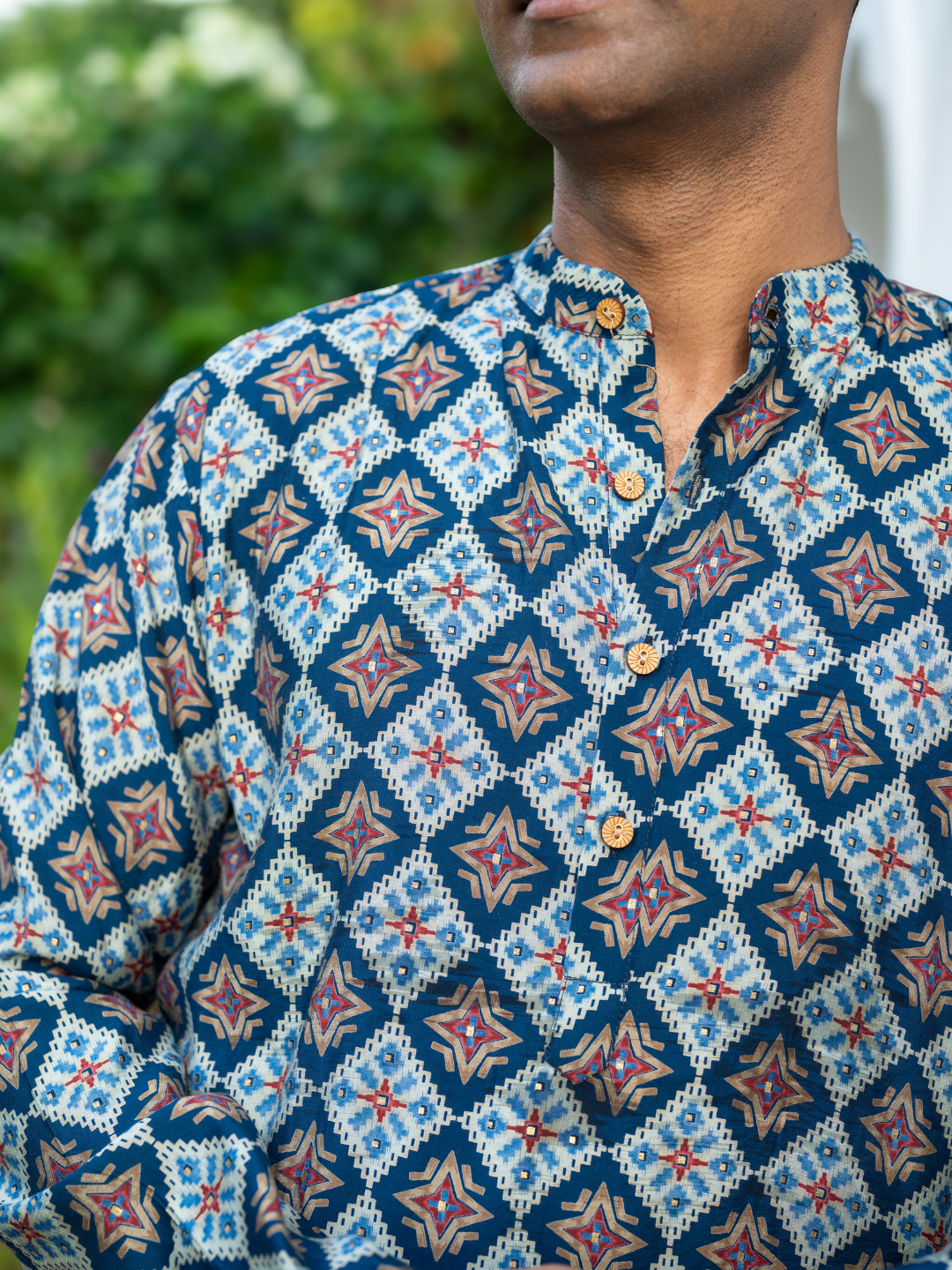 The deep blue kurta offers understated grace, while the pajama ensures ease of wear. The coordinating jacket adds refinement, making this set perfect for pujas, festive gatherings, or family portraits. With breathable muslin cotton, you’ll stay cool and confident through every celebration.