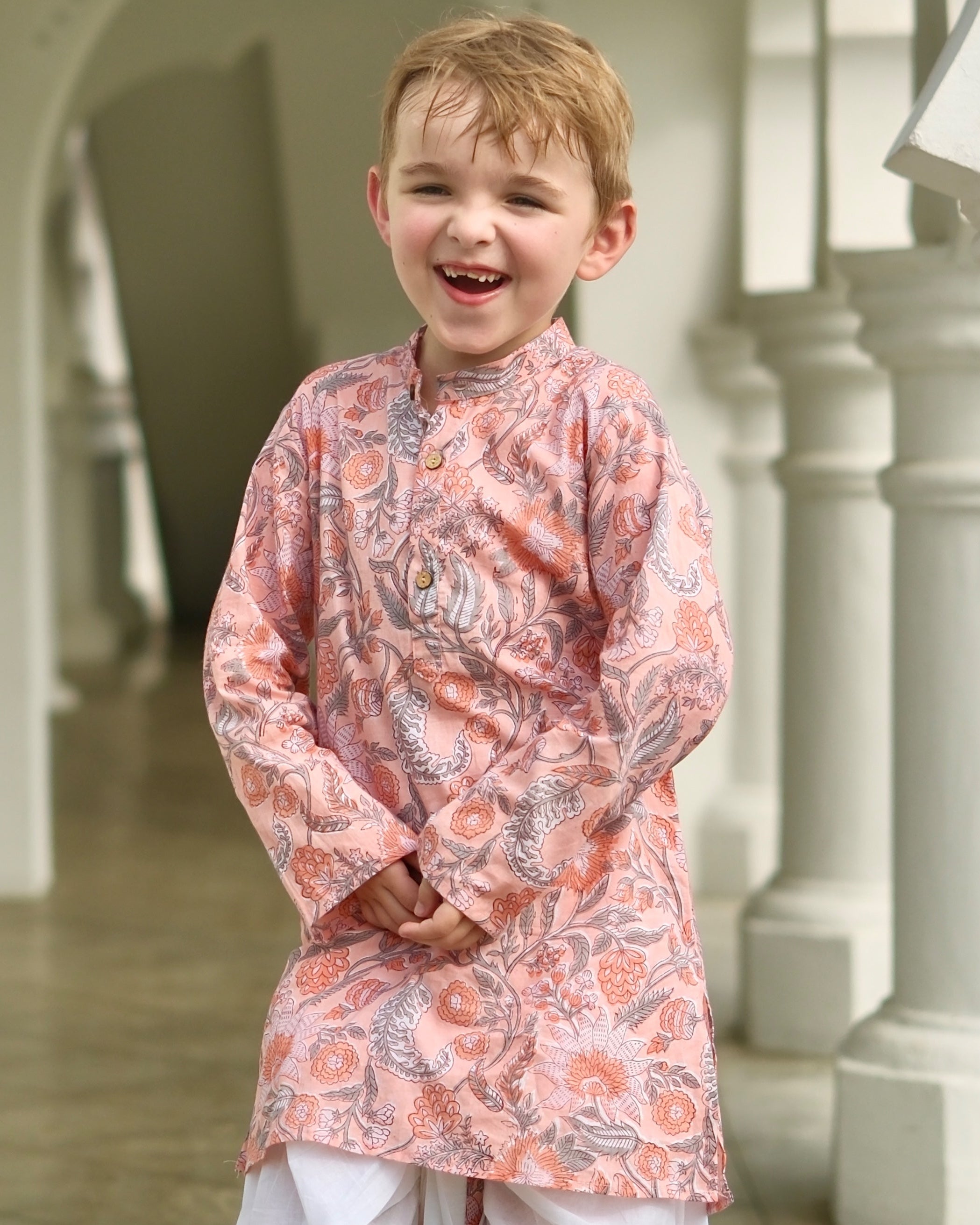 Devi Coral Boys Handblock Kurta Dhoti Set