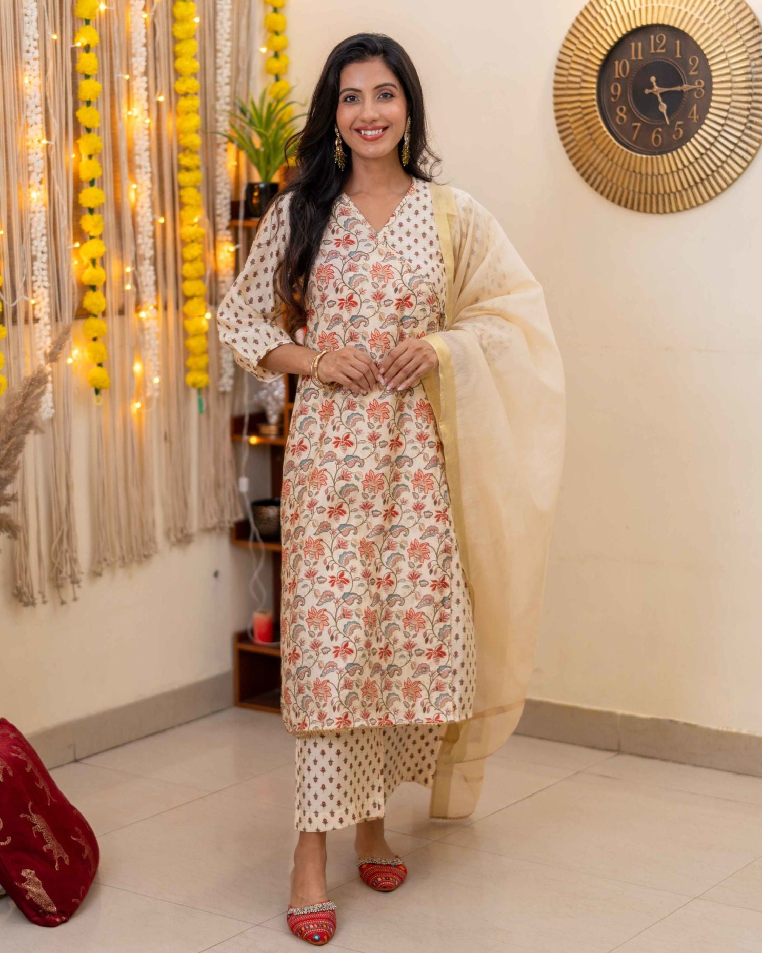 Nia Womens Pearl White Floral Angarkha Kurti & Salwar with Dupatta set in Muslin Cotton