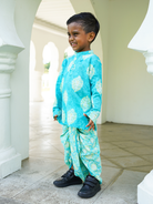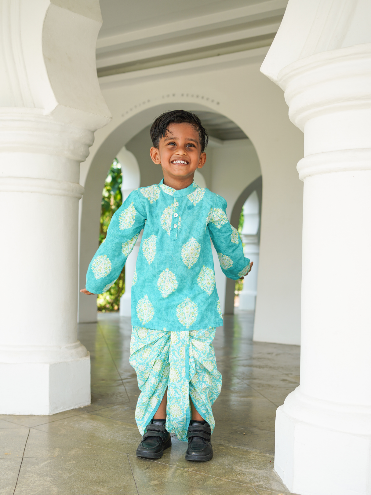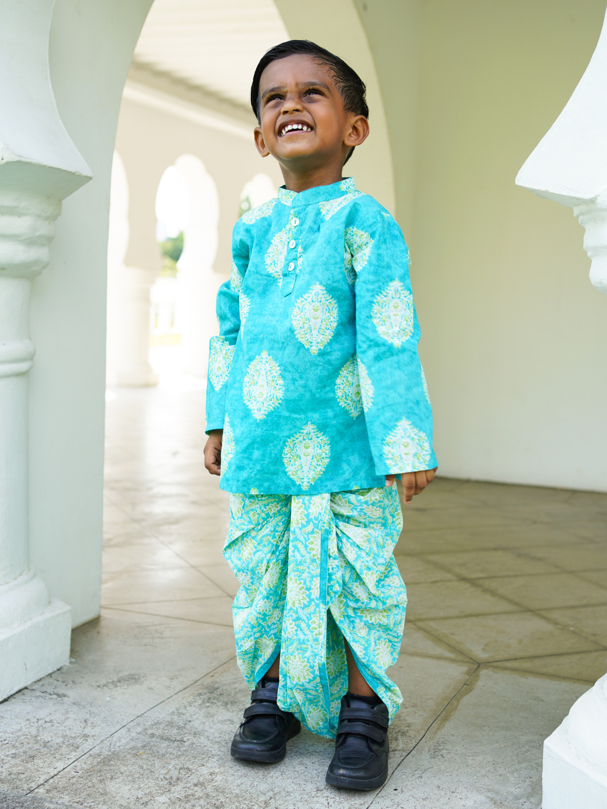 The Mira Blue Boys Kurta Dhoti in Cotton offers a refined blend of tradition and comfort. Crafted from soft, breathable cotton, this ensemble combines a vibrant blue kurta with a matching dhoti.