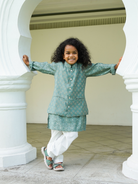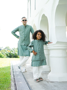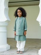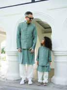 The Vir Sage Green Boys Kurta Pajama Jacket in Muslin Cotton blends timeless charm with modern elegance, making it an ideal outfit for Diwali, weddings, and festive family occasions.