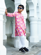 The kurta, in a lively pink shade, is finished with a delicate gotta-trim neckline that adds festive charm without being overdone. Teamed with soft white muslin cotton pajama bottoms, it stays airy, lightweight, and breathable—ideal for hours of play and celebration. The easy silhouette allows freedom of movement, while the vibrant color makes it picture-perfect for family moments.