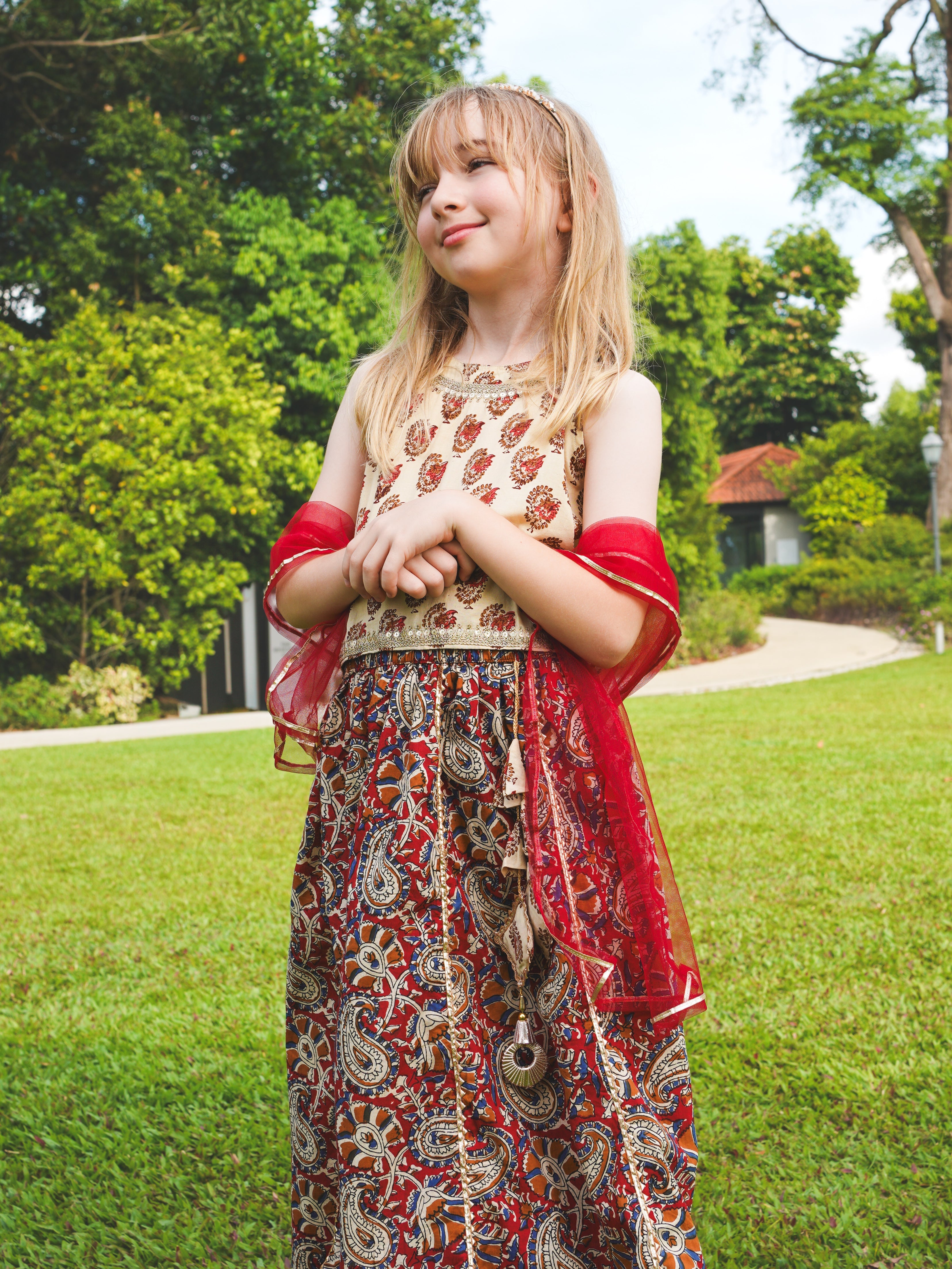 Nazara Girls Handblock Maroon & Beige Halter Lehenga Choli with Dupatta